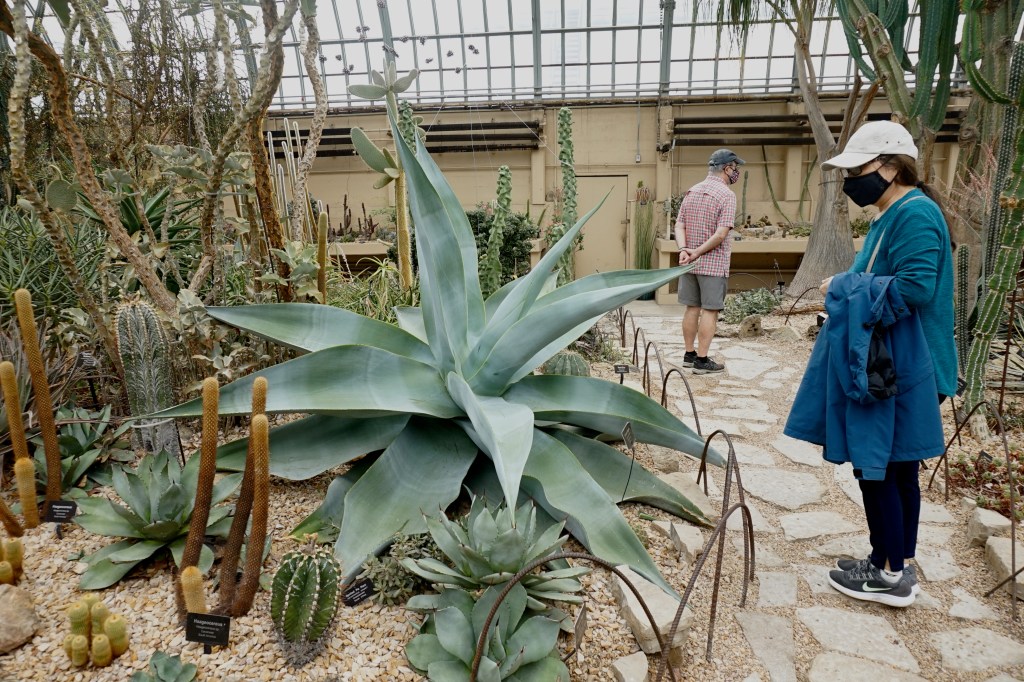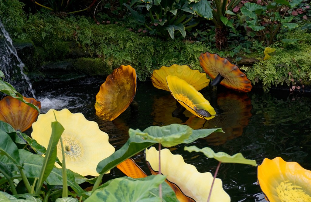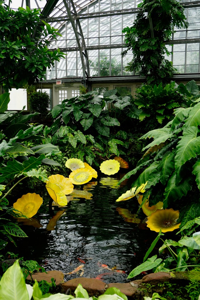 The indoor temperature was warm yet comfortable and not overly humid with each greenhouse designated to its own botanical environment such as palms, aroids, or a desert climate. Derek mentioned that the fern room was like stepping into Jurassic Park with mosses creeping up rock faces, and vibrant green blades draped over our heads as we walked around our swampy surroundings. To our pleasant surprise we saw the “Persian Lily Pads,” a glass installation created by the famous Dale Chihuly, interwoven in the aroid room as if they rose out of the water with the plants around them.