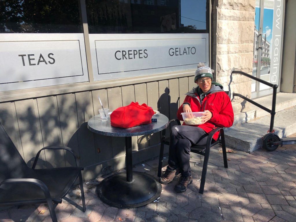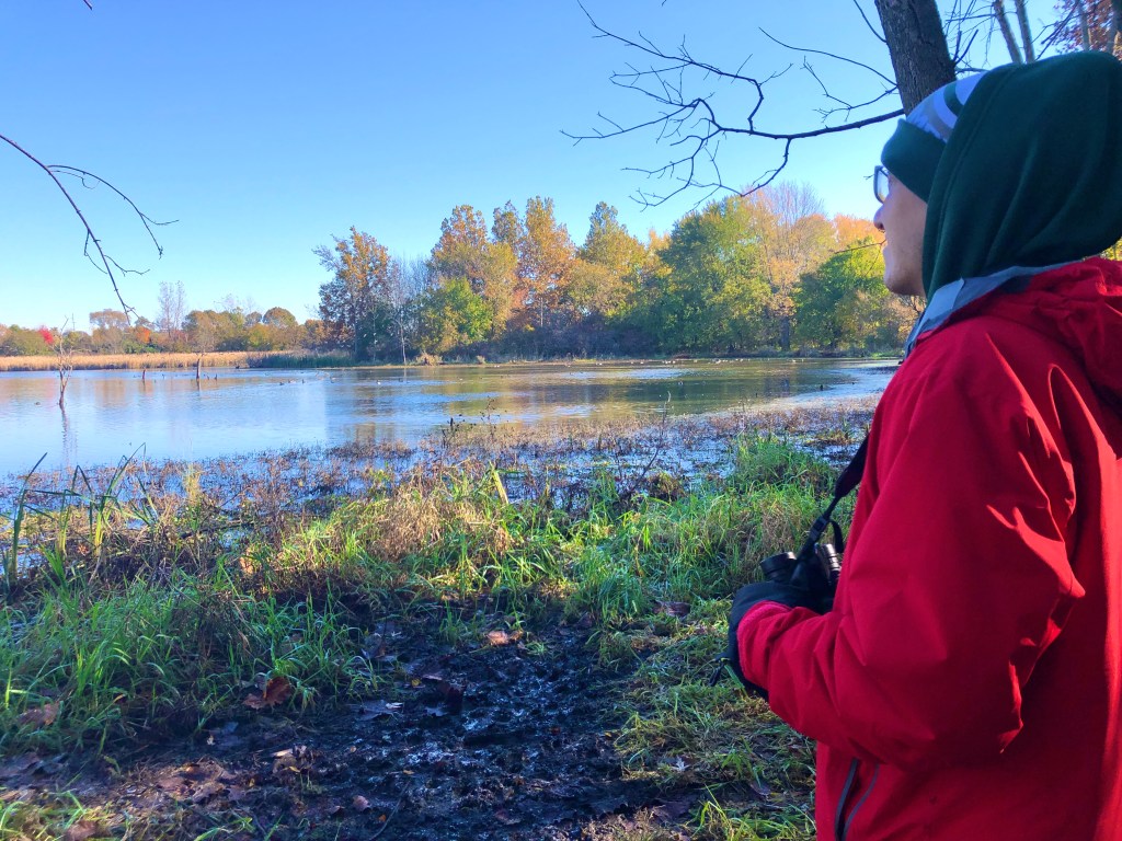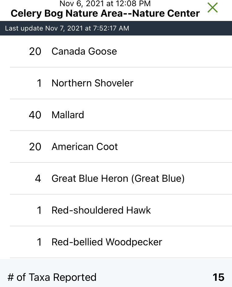 After a Saturday morning power breakfast, we left early to do a little exploring prior to the game at Celery Bog Nature Area. The sun was out and the fall colors illuminated bright yellow and orange hues as we hiked the trail tracking bird calls. The nature center offered walking sticks for visitors so Derek got a kick out of trekking with his trusty walking stick. The trail hugged the perimeter of wetland basins where we spotted three Great Blue Herons and large flocks of ducks. In the trees, there were tiny birds zipping around us and a few woodpeckers tapping beats including the beautifully speckled Northern Flicker. When we made it out to the grasslands, there was a strange shriek calling from the highest trees that the Merlin Bird app identified as the Red-Shouldered Hawk. With our binoculars, we were able to see it soaring above as it looked for prey. The bog would have been a beautiful place for us to run but we enjoyed an hour of walking about enjoying nature.