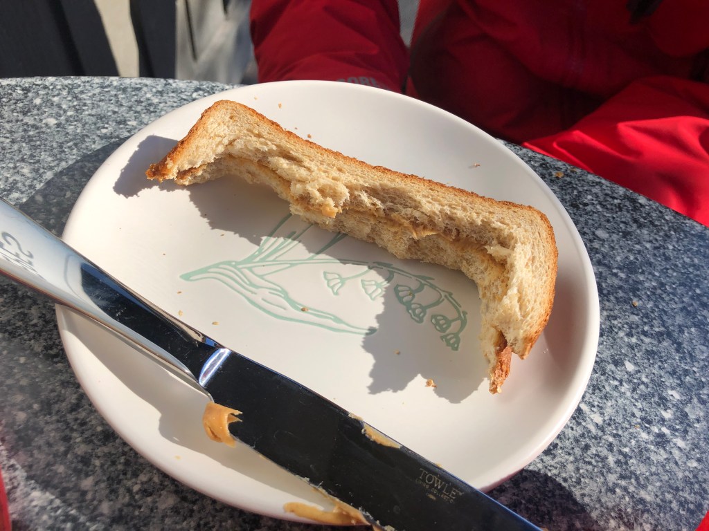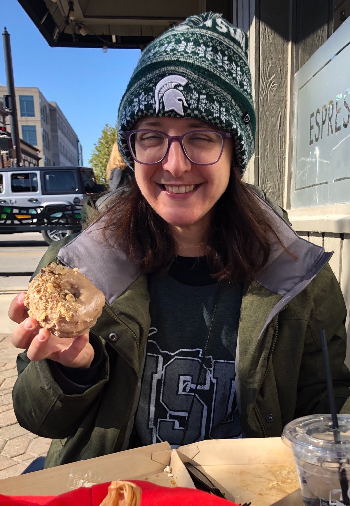 The football traffic was picking up in town and we were relieved to have pre-registered parking at the University Garage. It was a convenient process to have our e-ticket scanned on the phone and leave our car there to walk from there on out. We had lunch at the Greyhouse Coffee & Supply Co. that was reviewed on the Big 10 Campus Eats TV show. I enjoyed a “Monkey Dog Unleashed” savory crepe and we split a Maple Walnut doughnut made to order from scratch to round out our picnic lunch of peanut butter sandwiches, popcorn, apples, and mini-oranges. It was a quaint location for us to take in the pre-game atmosphere. The MSU cheerleaders walked by at one point and I shouted out “Go Green!” with a hearty “Go White!” cheered back to us. We did get a few taunting “Boiler Ups!” from some college kids walking by too.