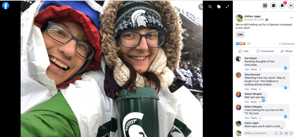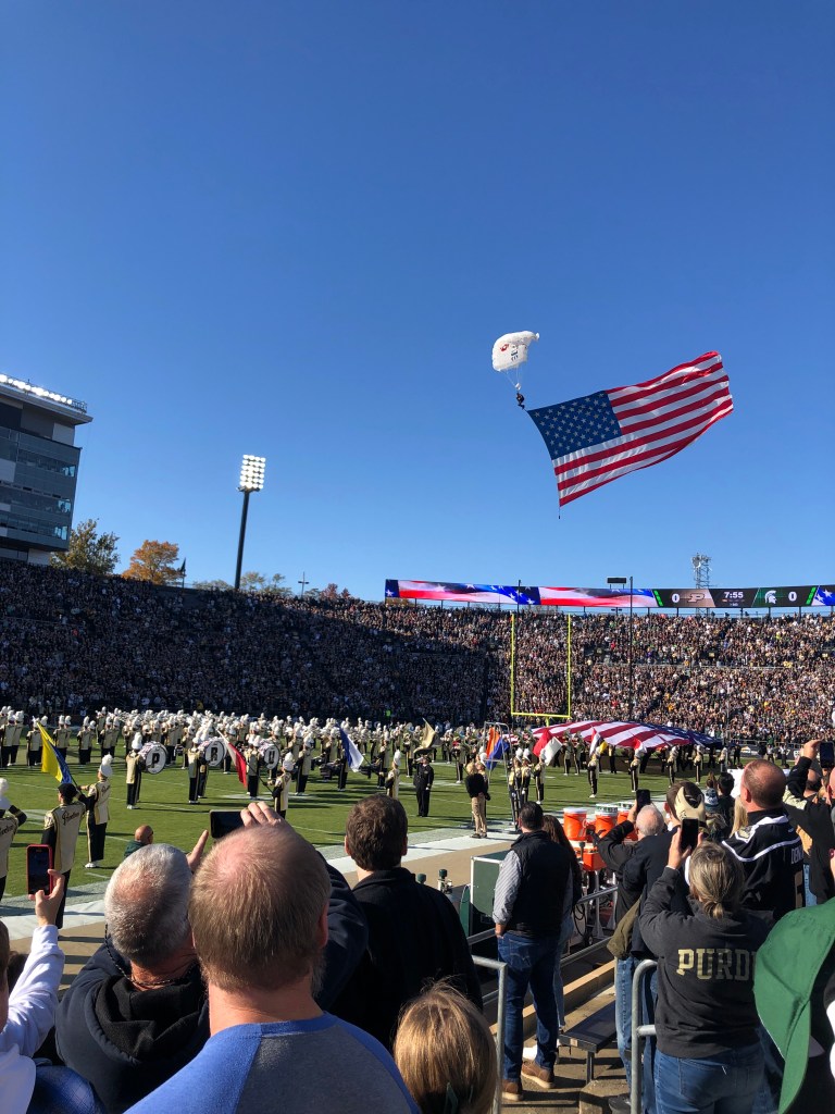 As we found our seats, we were surprised at just how close we were to the field. The Spartan team was right in front of us with Coach Mel Tucker pacing back and forth with the players. It was fun to see the players warm up and the Purdue band dance their way in during the opening events. Derek pointed out the names of all the coaches and I was excited to pick out some of the big-time players including the Heisman candidate Kenneth Walker III #9! A huge highlight was seeing parachuters fly into the stadium during the national anthem as part of Purdue’s memorial to Veteran’s Day next week. We were lucky to be in a green section of MSU fans who made the trip down to cheer on the team. The stadium was a packed house and the roaring noise was something that I hadn’t experienced in a long time.