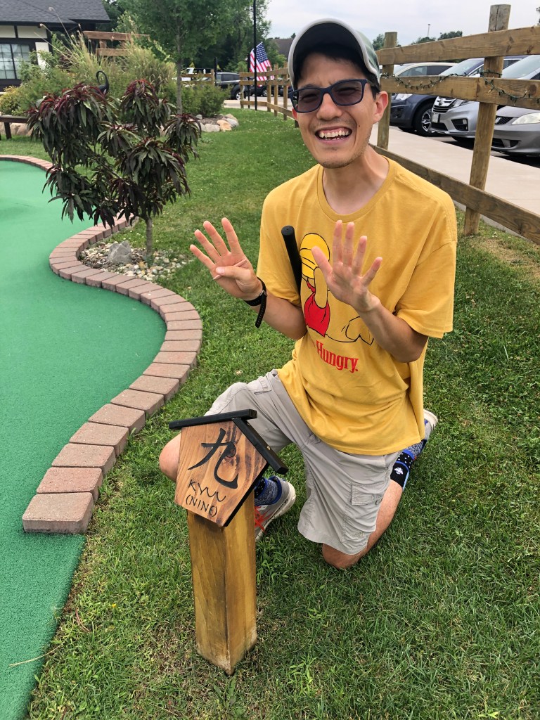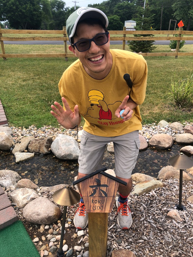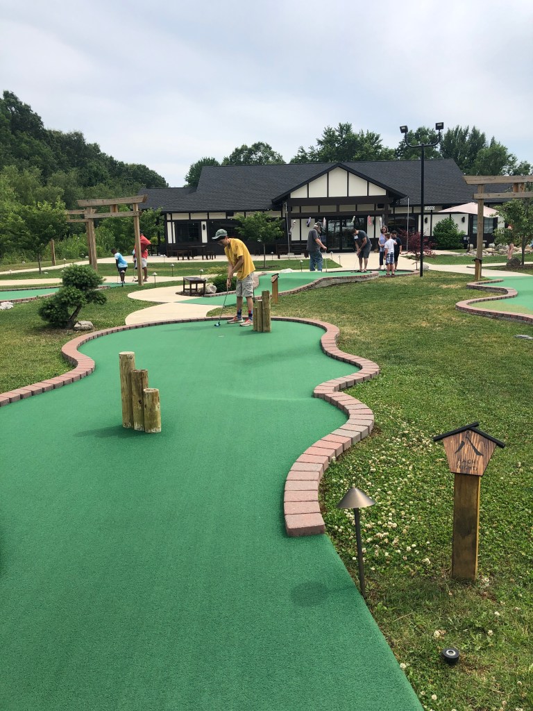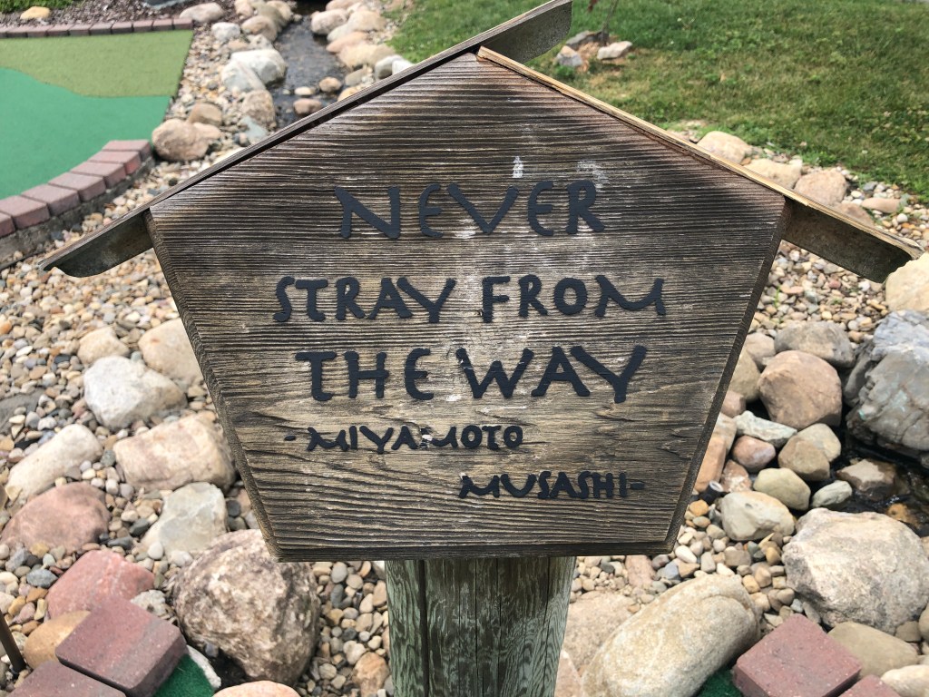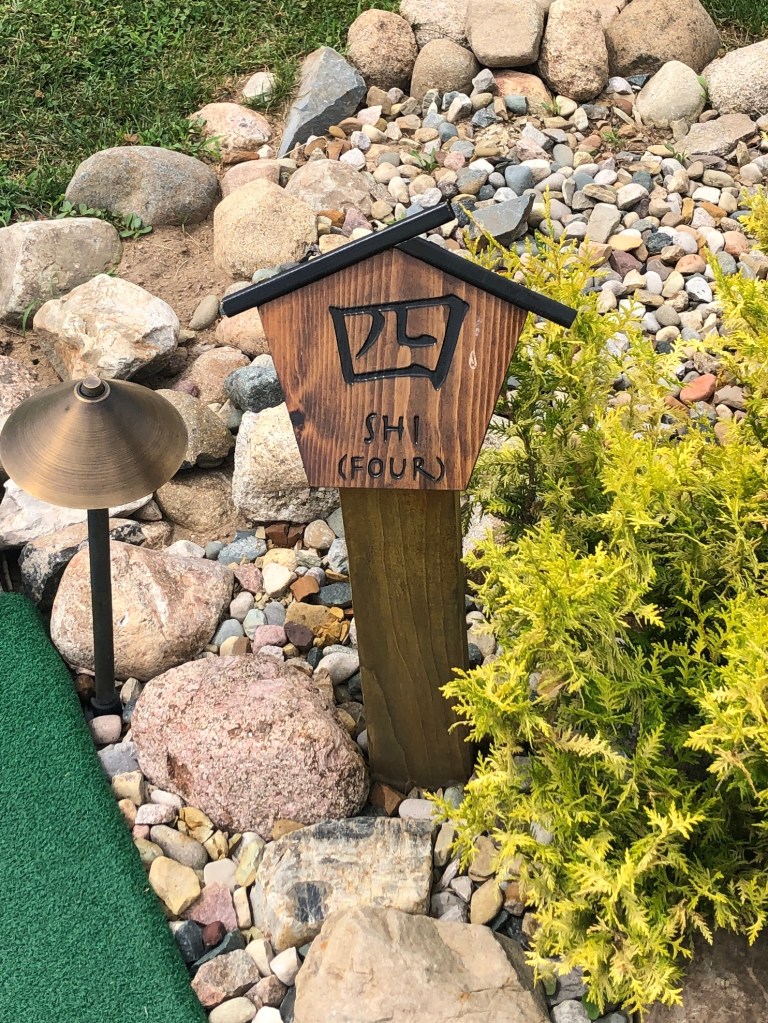 Konnichiwa! こんにちは Behold, golfers who prefer the miniature game with green carpets, waterfalls, and fluorescent balls, there is a new course with a Japanese inspired theme in the unexpected locale of suburban Granger, Indiana called Ninja Golf! We may have played nearly all the putt-putt courses in the Northwest Indiana area so it was an exciting discovery to return to Michiana for this little gem. Ninja Golf is set up into three 9-hole courses, East, Middle, and West, with unlimited play at $10. The facility also offers a nature walk, laser maze, kabuki theatre, and karaoke lounge with ice cream treats featuring mochi and pocky.