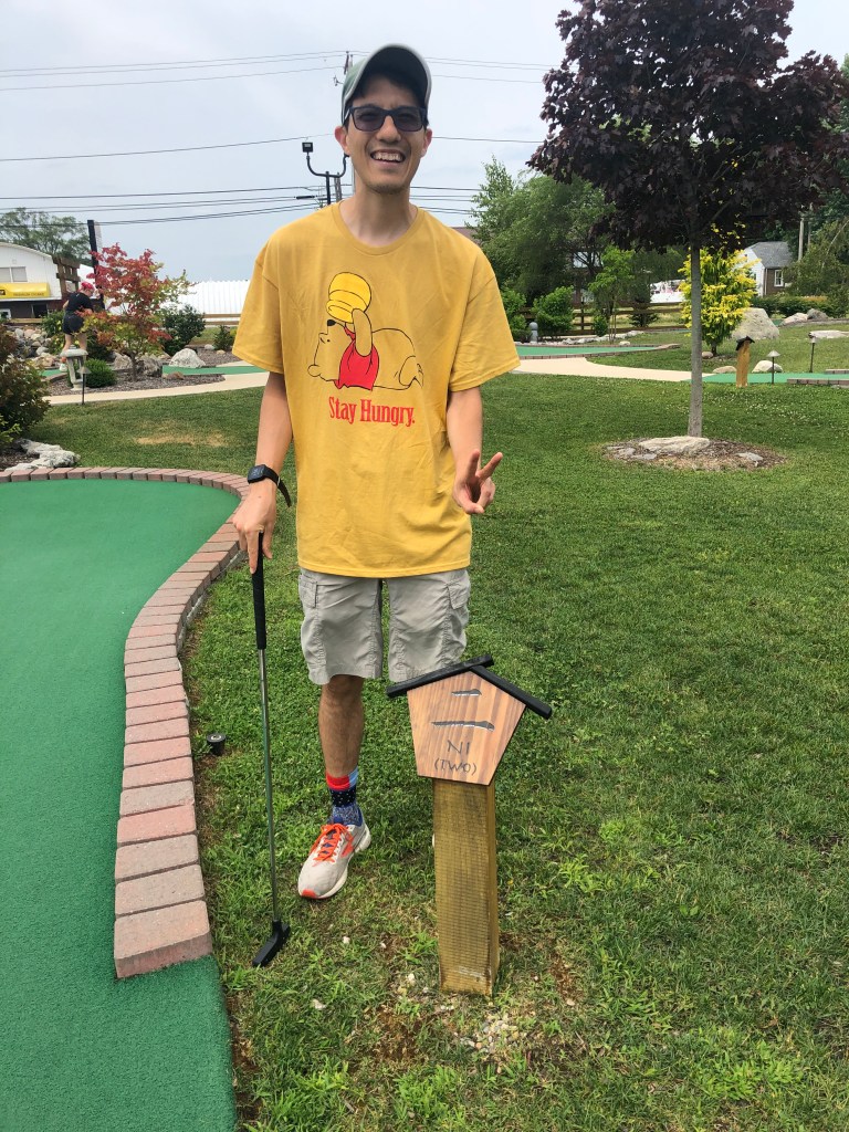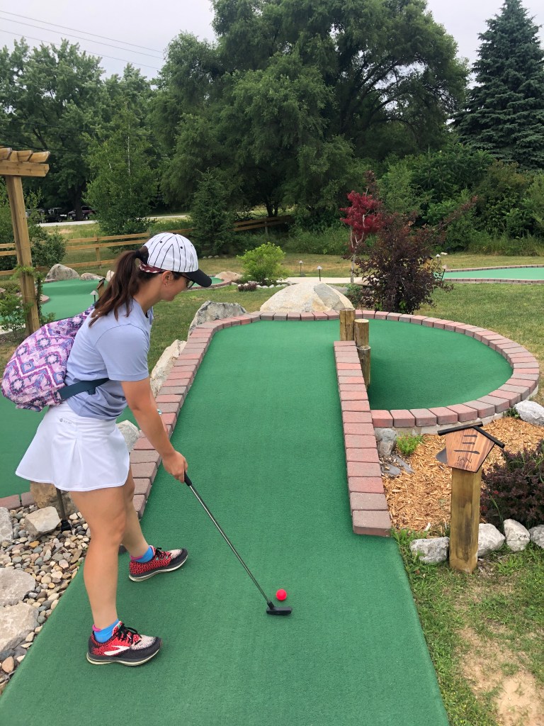 We played all three courses for 27 holes with Derek coming out on top by a whopping 12 strokes! My favorite hole was a funnel swirl on the East course.