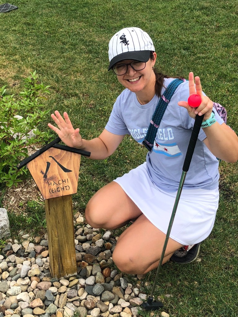 On the first course, we had a little fun posing by the markers and taking photos of the garden sculptures while waiting for the group in front of us to finish playing.