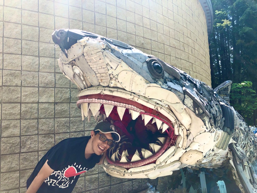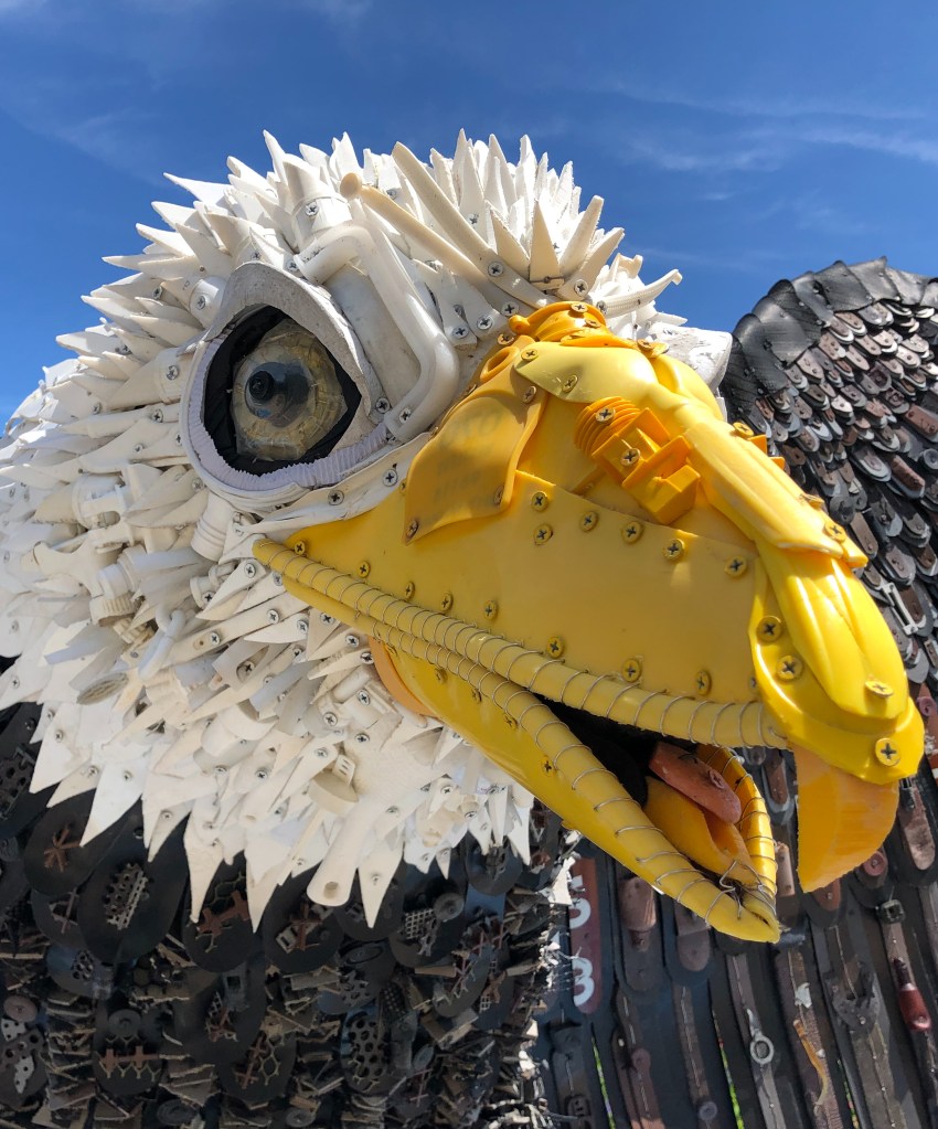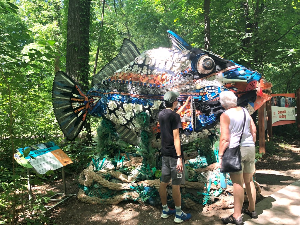 As we made our way around the zoo map, we stopped to admire each of the sculptures alongside the animals who live there. One of my favorites was the fish with a goofy smile! Derek liked the Bald Eagle and Aunt Jackie said that she loved them all, but I think she was most fascinated by the details found inside the mouth of the Great White Shark! The level of detail in consideration of found objects was extraordinary as we spotted shredded sneakers, lighters, toothbrushes, golf balls, fishing nets, etc, carefully arranged into overall sections of color that blended together as a puzzle of oceanic mishaps.