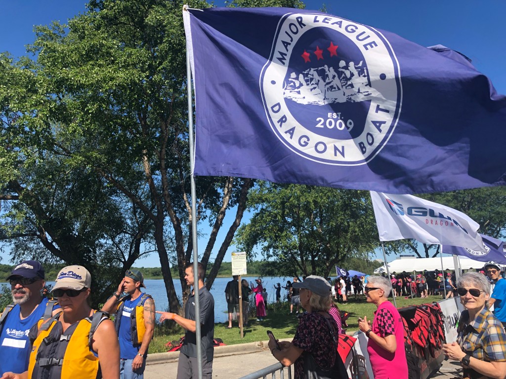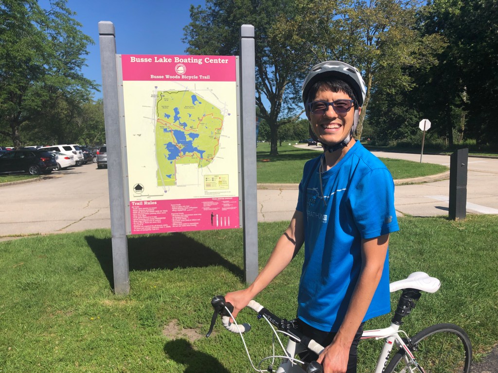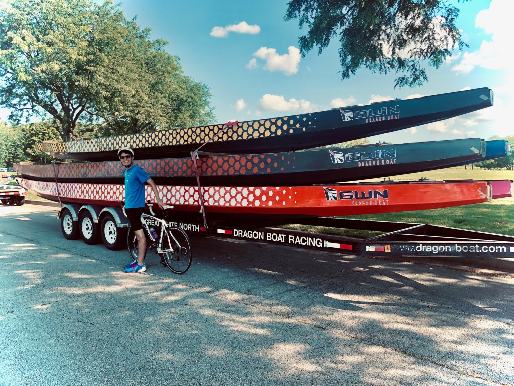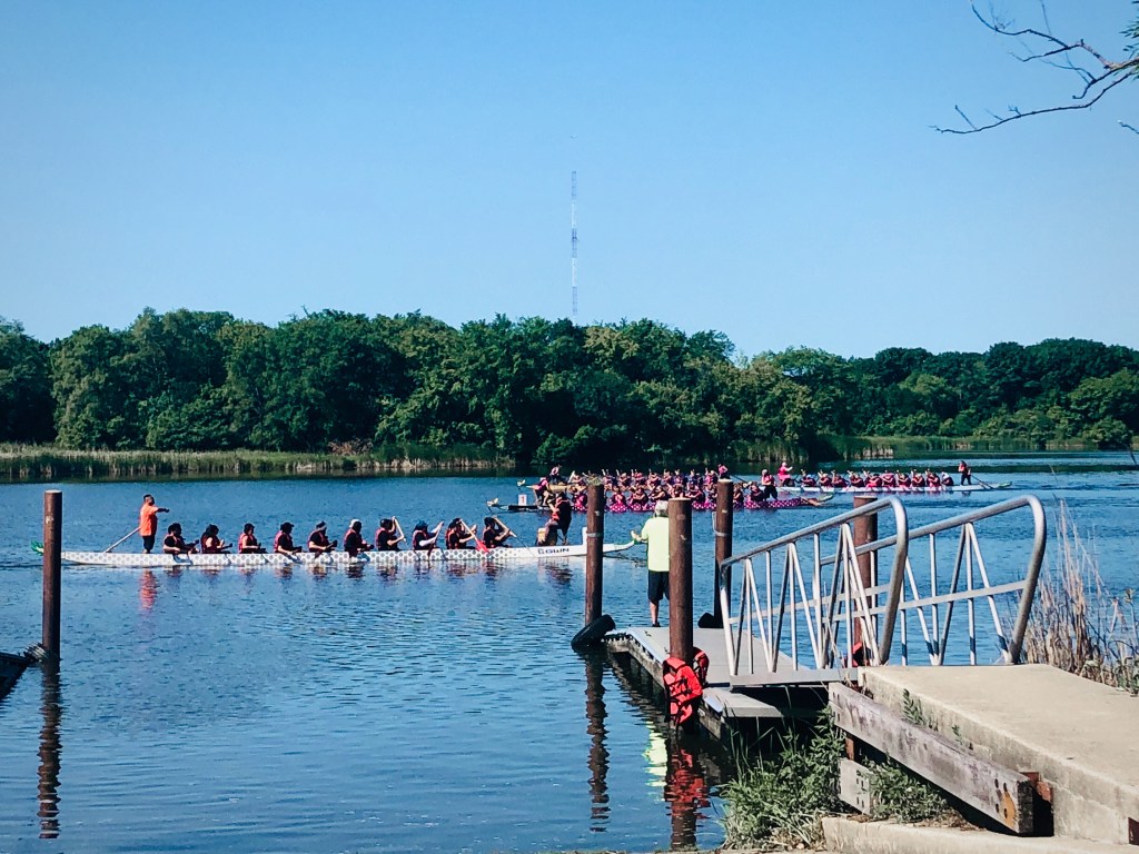 We wanted to hit the trail early so we left home by 7:30 am for an hour and 15 minute drive. The plan was to park at the north end of Ned Brown Meadow and bike two miles down to the Busse Woods Trail loop that we could then continue on to the Salt Creek Trail that connects Busse Woods to the Brookfield Zoo. As we pulled into the parking lot, we were shocked to see the lot completely full on a Sunday morning due to an event that was happening with vehicles continuing to come in behind us, eager for parking spots. The World’s Biggest Bounce House at 13,000 square feet was ballooned for public entertainment and there was no availability for parking. We relocated to the Busse Woods Boating lot at a different access point to find another lot filling up where we finally managed to find a spot. The Chicago International Dragon Boat Festival races were being held on the water and fans were cheering on teams from the shore. We watched a few of these exciting races on their massive boats before starting our ride.