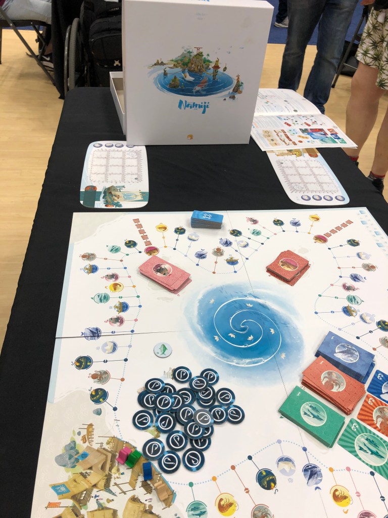 Cartographers Heroes is a map-drawing game with tetris shapes designated for different terrain types in symbol and color. There are four seasons from Spring to Winter where players flip cards to draw their shapes in specific arrangements on their kingdom maps to earn the most reputation stars. Each season presents new challenges to accomplish and a little sabotage from opponents’ monsters and zombies. I capitalized on a few early objectives to score big and placed 2nd out of 8 in the group! The game took a little over an hour but it seemed to fly by while we were fully invested in the outcome of each card competing in an 8-player strategy game. What an amazing opportunity it was for us to experience!