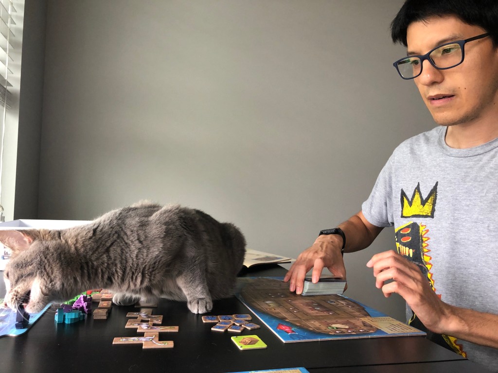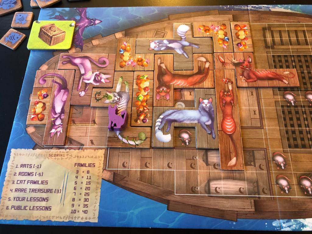 Sprout, our board game cat, even put her two-cents in by flicking the Isle of Cats pieces off the table as we tried to save wild cats from the doomed island of treasure. The game designer, Frank West, had a good sense of humor by suggesting that we use the box as an alcove for our cat to rest in while we play. The medium-weight, card-drafting, polyomino cat placement game is a rescue mission to capture as many wild cats of unique coat colors by capturing them in baskets and arranging them on our ships to protect them from the evil Lord Vesh who is coming to Squalls End. We just got the Isle of Cats and already we’ve played it three or four times through. Oh, the life of a board gamer.