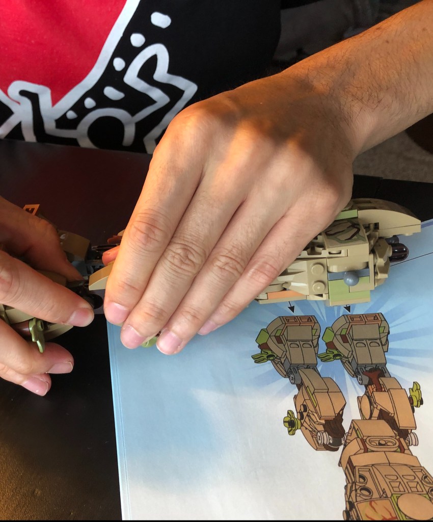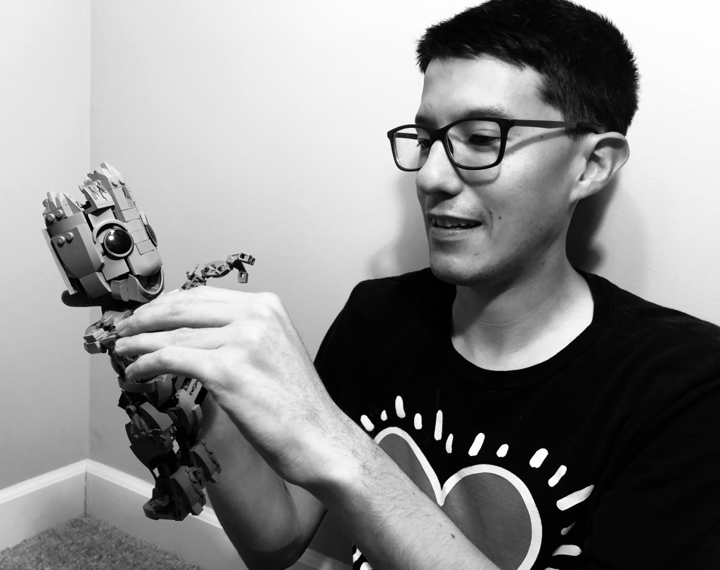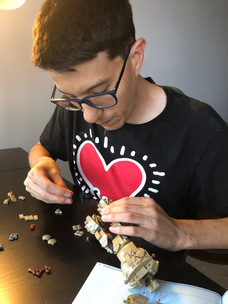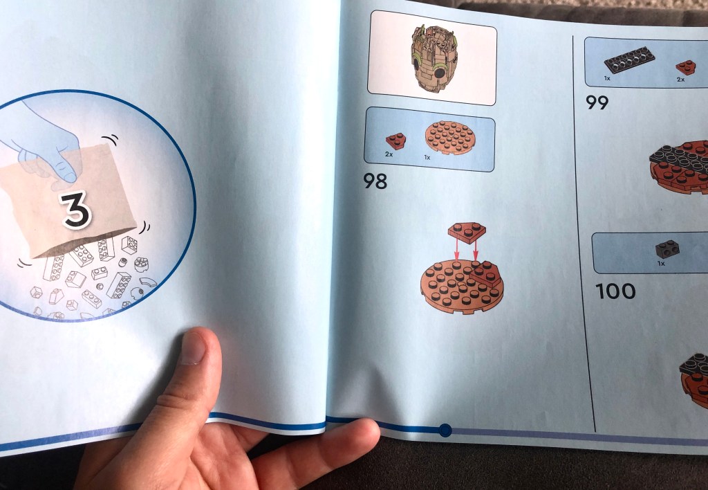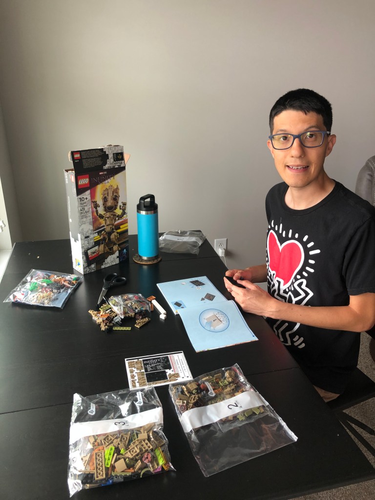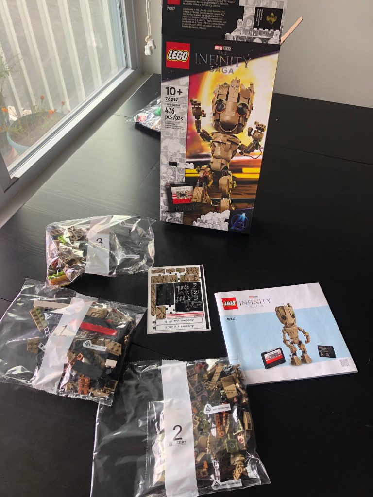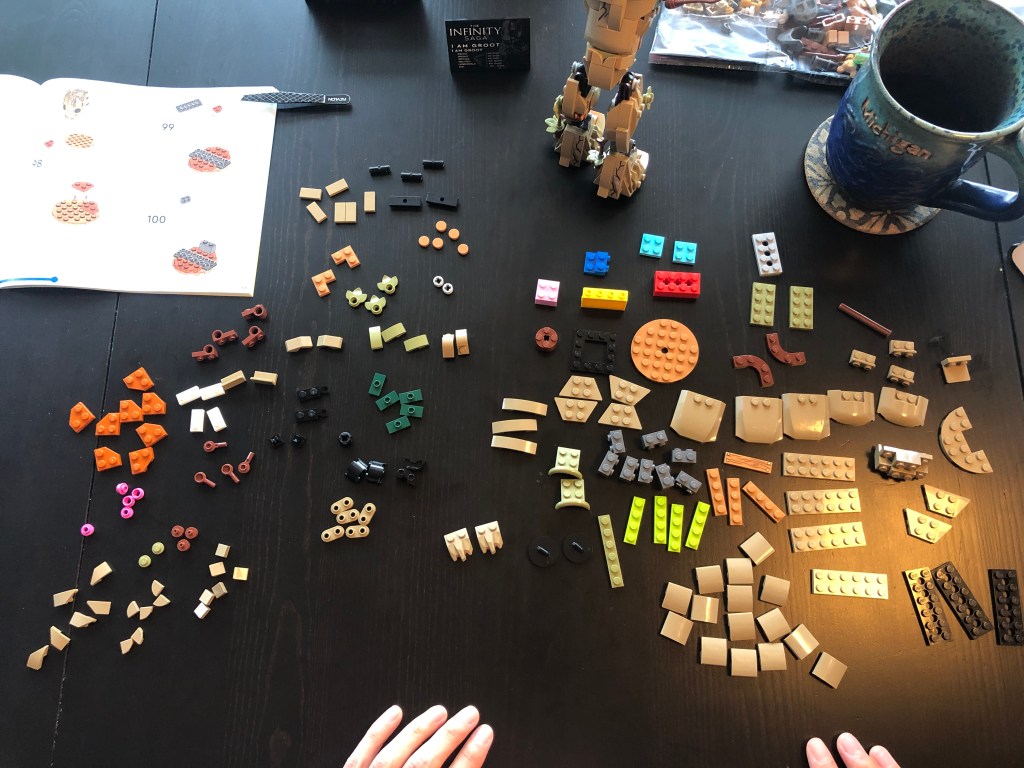 Derek popped open Groot’s box of legos and sorted through the contents of three phases of construction. Building a lego character is a lot like piecing together a 3D puzzle with 162 steps in the instruction manual. The inventory alone of such tiny pieces is extraordinary.