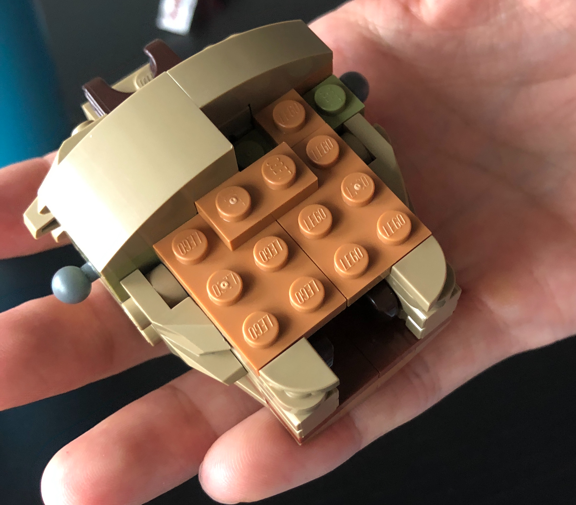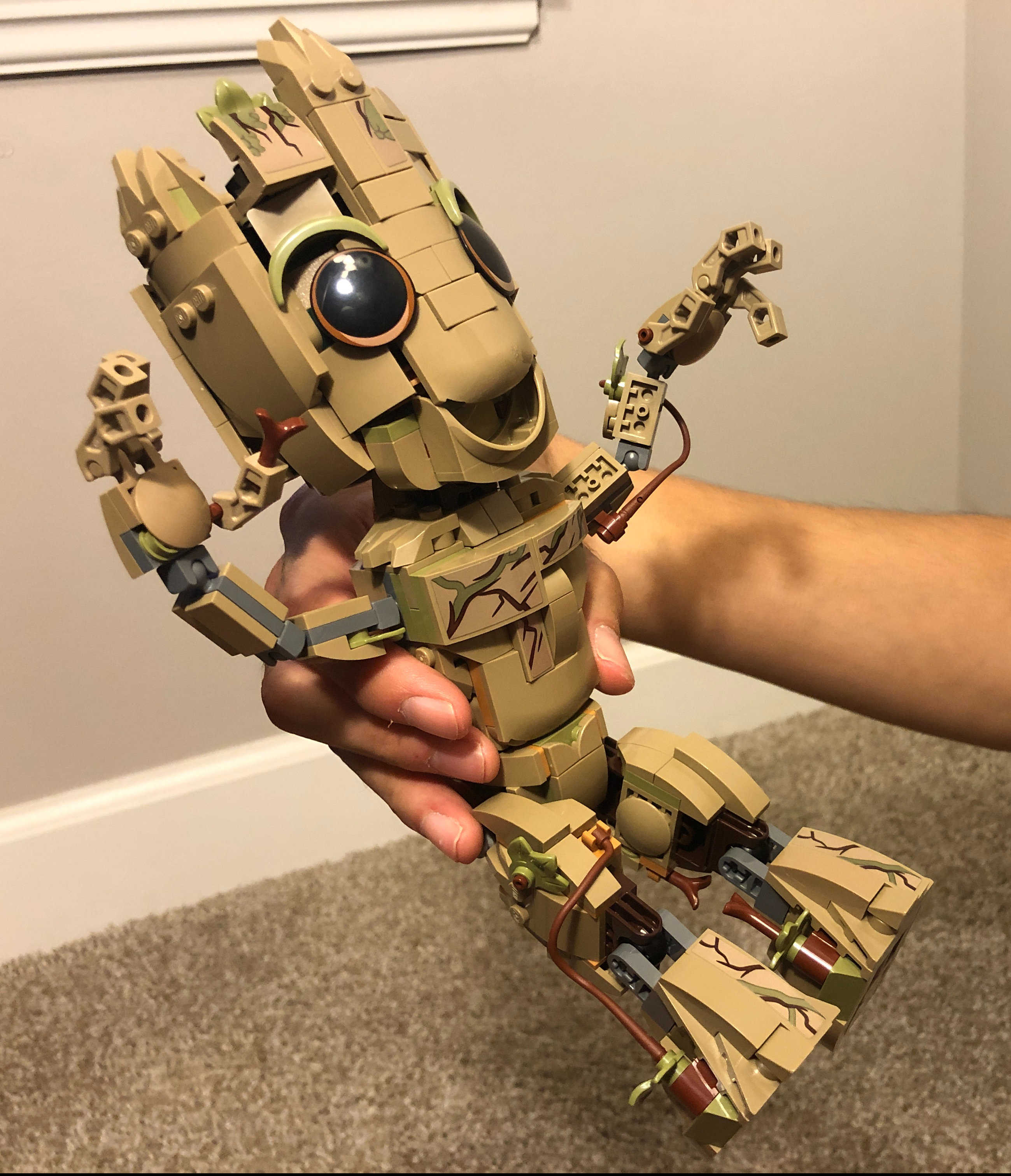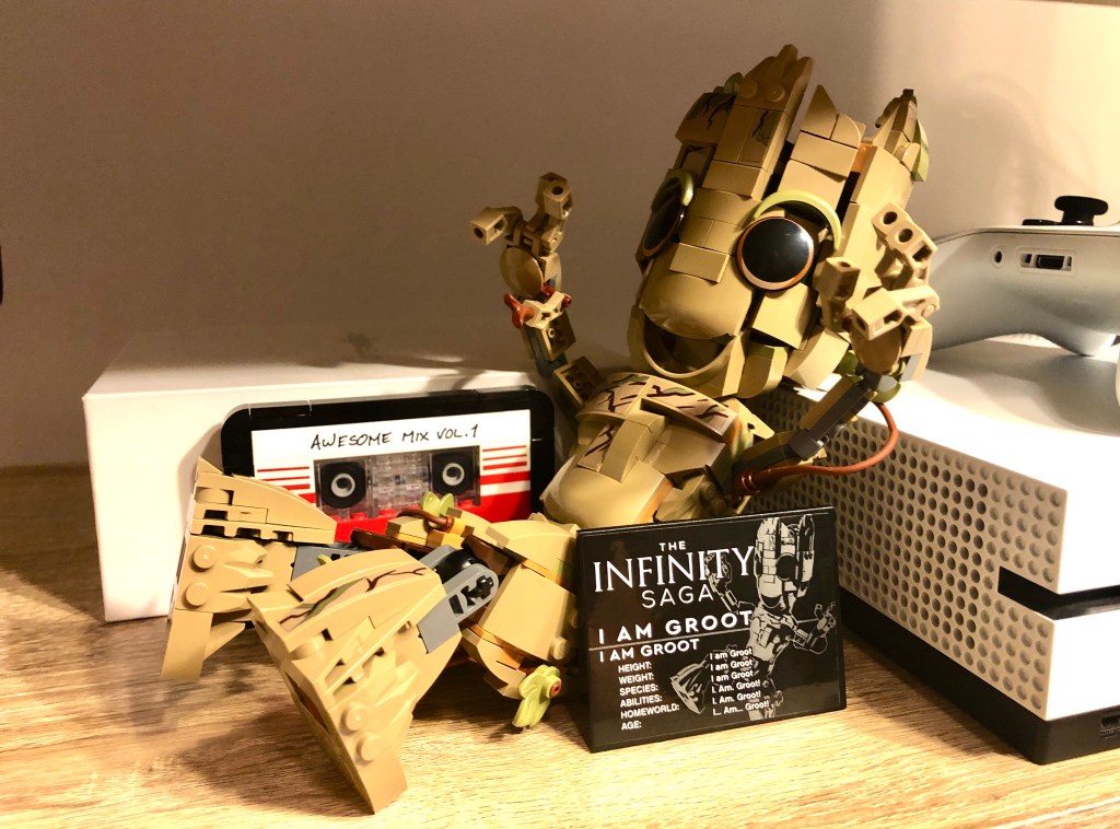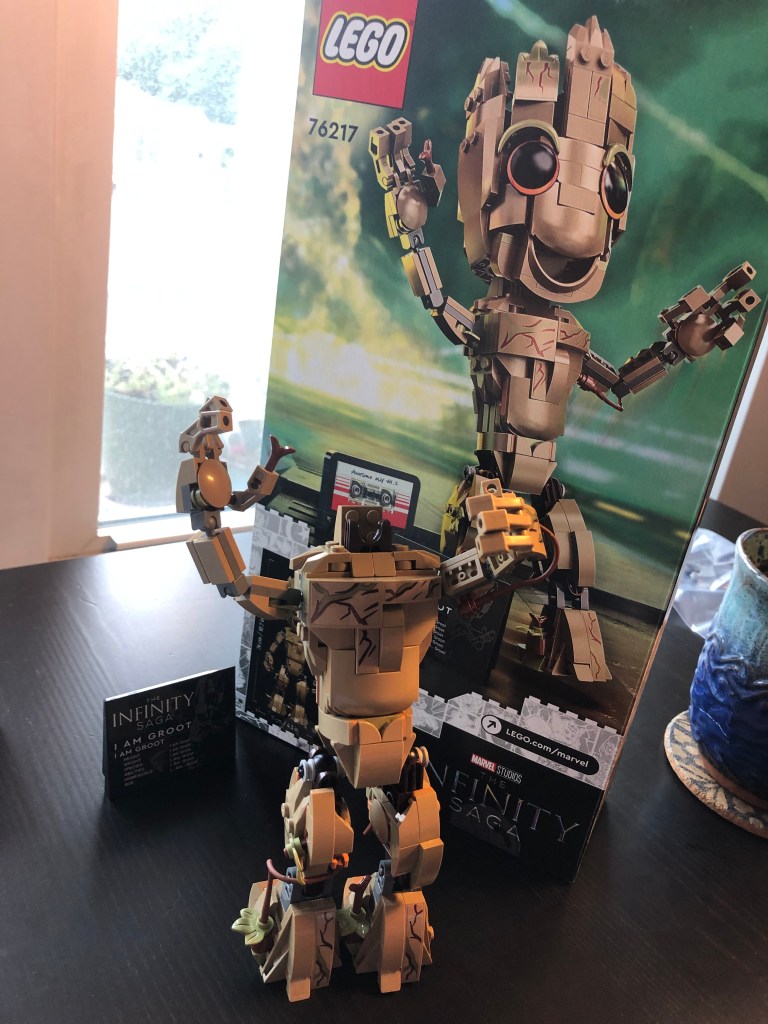 After clicking all 476 bricks together Derek was proud to position Lego Groot in the living room for permanent display. I am still amazed at the realistic depiction of the cassette tape and the 3D nature of Groot that were built from the tiniest lego bricks. While it looks like a toy, Groot is still somewhat fragile. As I scooted him over ever so slightly to take a photo, one of his twigs popped off and Derek shifted back into operation mode to fix him. Nevertheless, he sprung back to life as an extraterrestrial superhero would. I am GROOT!