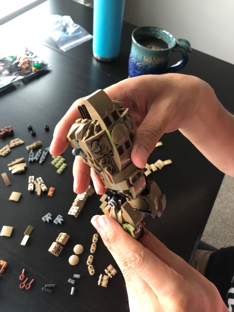 A few hours into the project, I left to buy ingredients from the grocery store to prepare dinner. When I returned, Groot was a headless tree zombie hovering from the weight of his stumps with twiggy fingers outstretched to his maker as Derek assembled the next stage of legos.