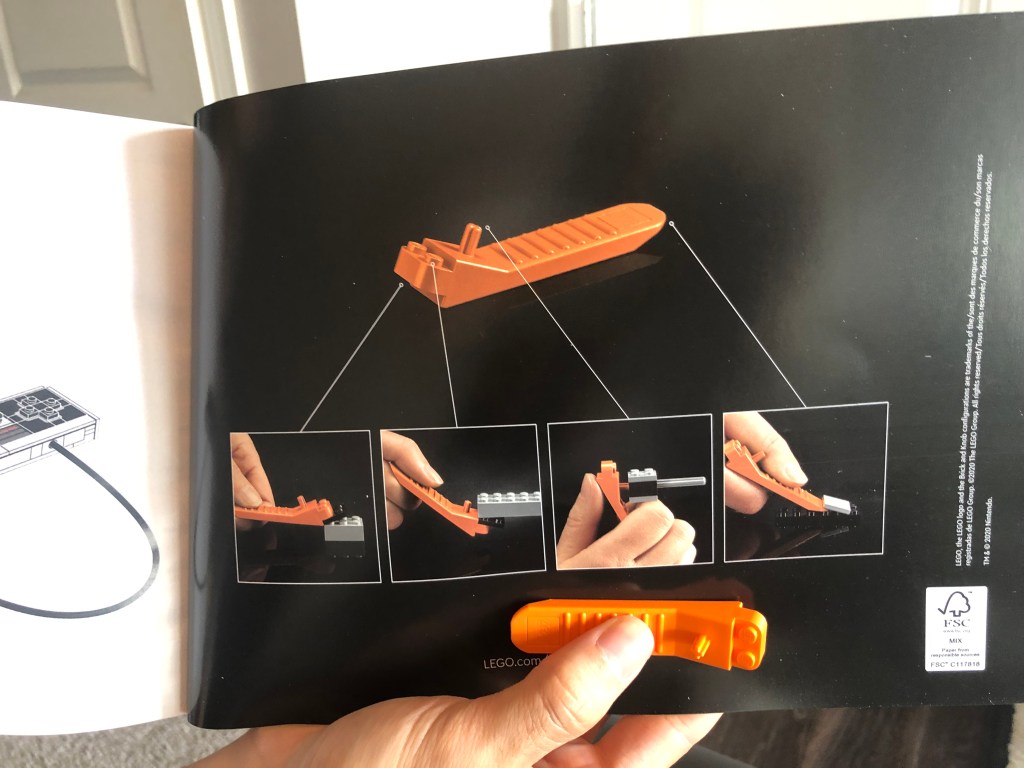 LEGO supplied us with a unique tool for separating pieces that have been tightly pressed together. If you make a mistake and need to pull apart the pieces, the “Lego Brick Separator” will do the trick! The tool is a beautiful thing, a bright orange piece of plastic sloped with a few funny bits at the wide end. This tool’s purpose is to become a wedge for separating bricks from base plates, a lever for applying pressure up or down to pull bricks away, and a sort of pokey bit for removing wheels from axels.