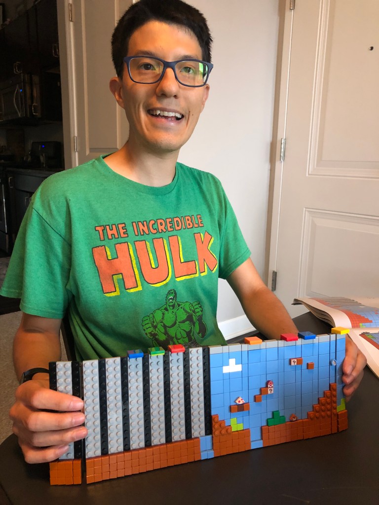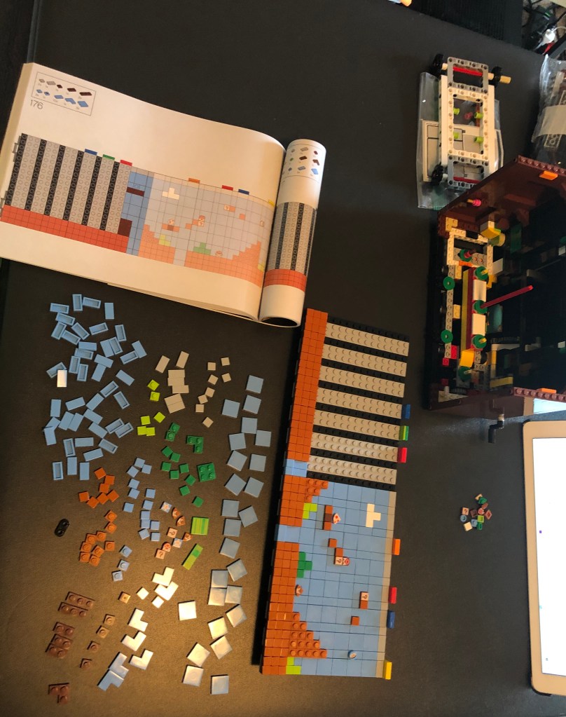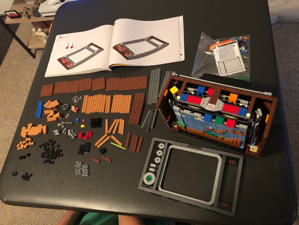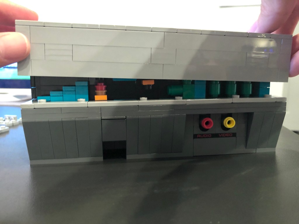 The unique challenge with the vintage TV is the functional scrolling screen to demonstrate Mario’s pathway in Super Mario Bros. The LEGO designers created a TV with all the moving parts that scroll reliably without clashing and a gearing system with a hand crank that smoothly rotates the screen. Derek not only had to build the TV structure, but assemble the inside of the screen with its moving lego panels. If not completed correctly, this function does not work as the designers created it.