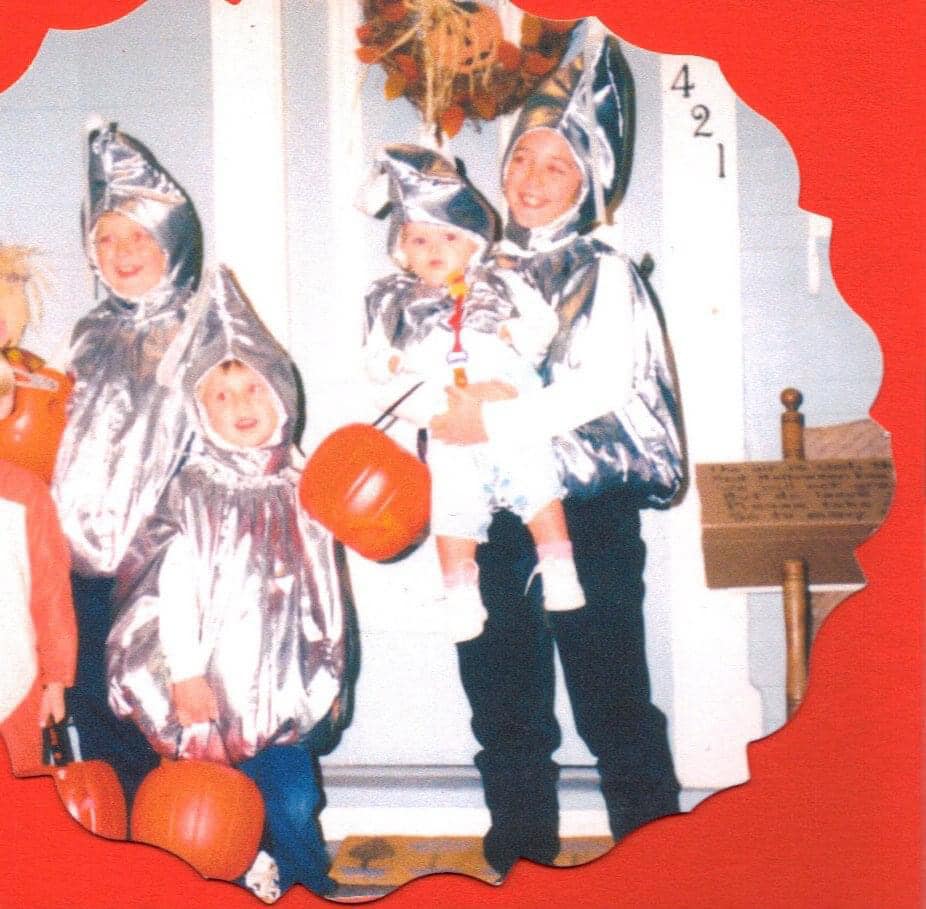 Halloween was a big deal in my family growing up. My Aunt Lisa used to tell me that it was her favorite holiday because it’s the one day a year when you can be anyone you want to be! She sent care packages to me during my college years around Halloween with popcorn and candy to share with my friends. My mom got a little creative each year by dressing up all four of us in handmade outfits that she created by sewing machine or repurposed from costumes tucked away in Grandma Berger’s attic.