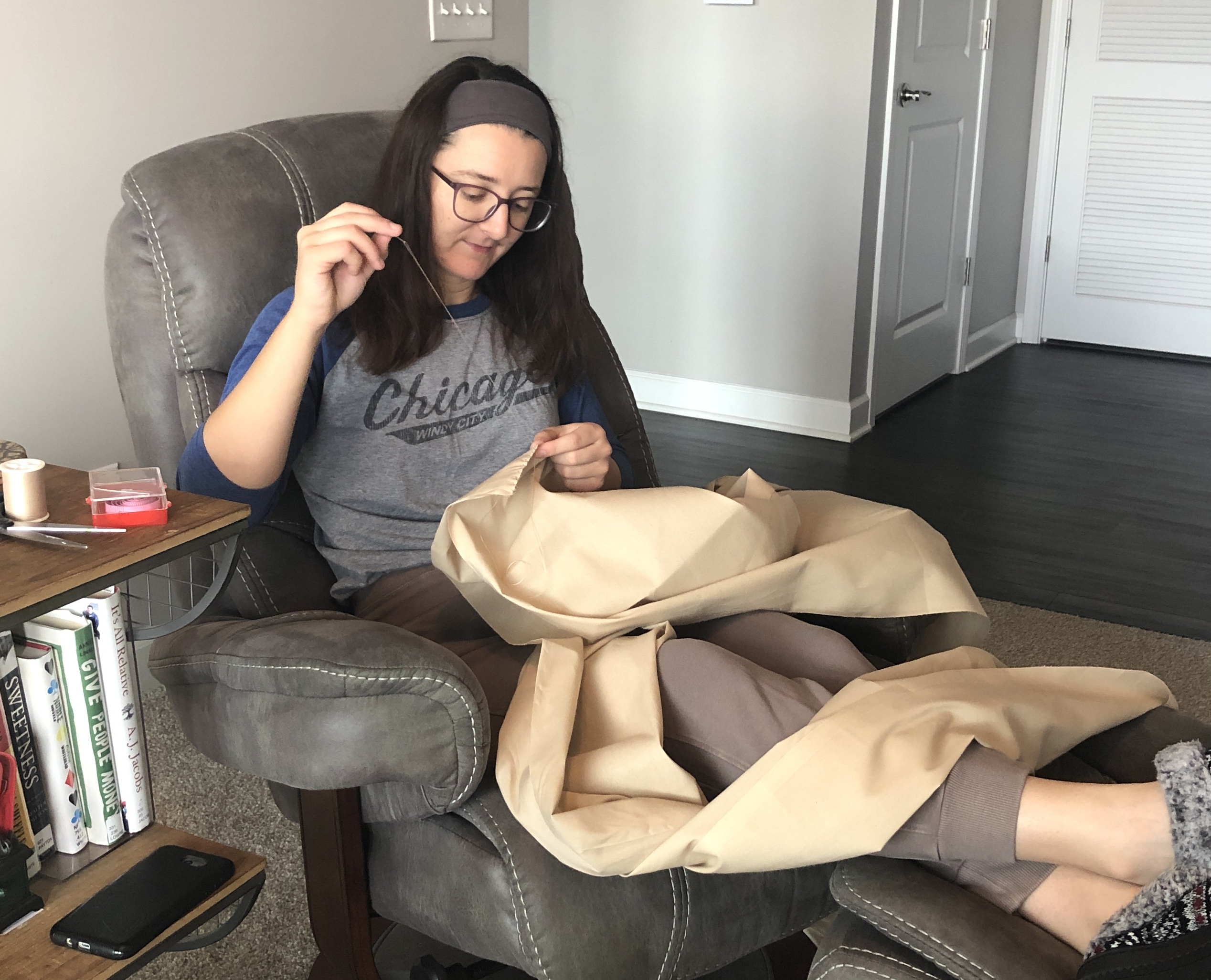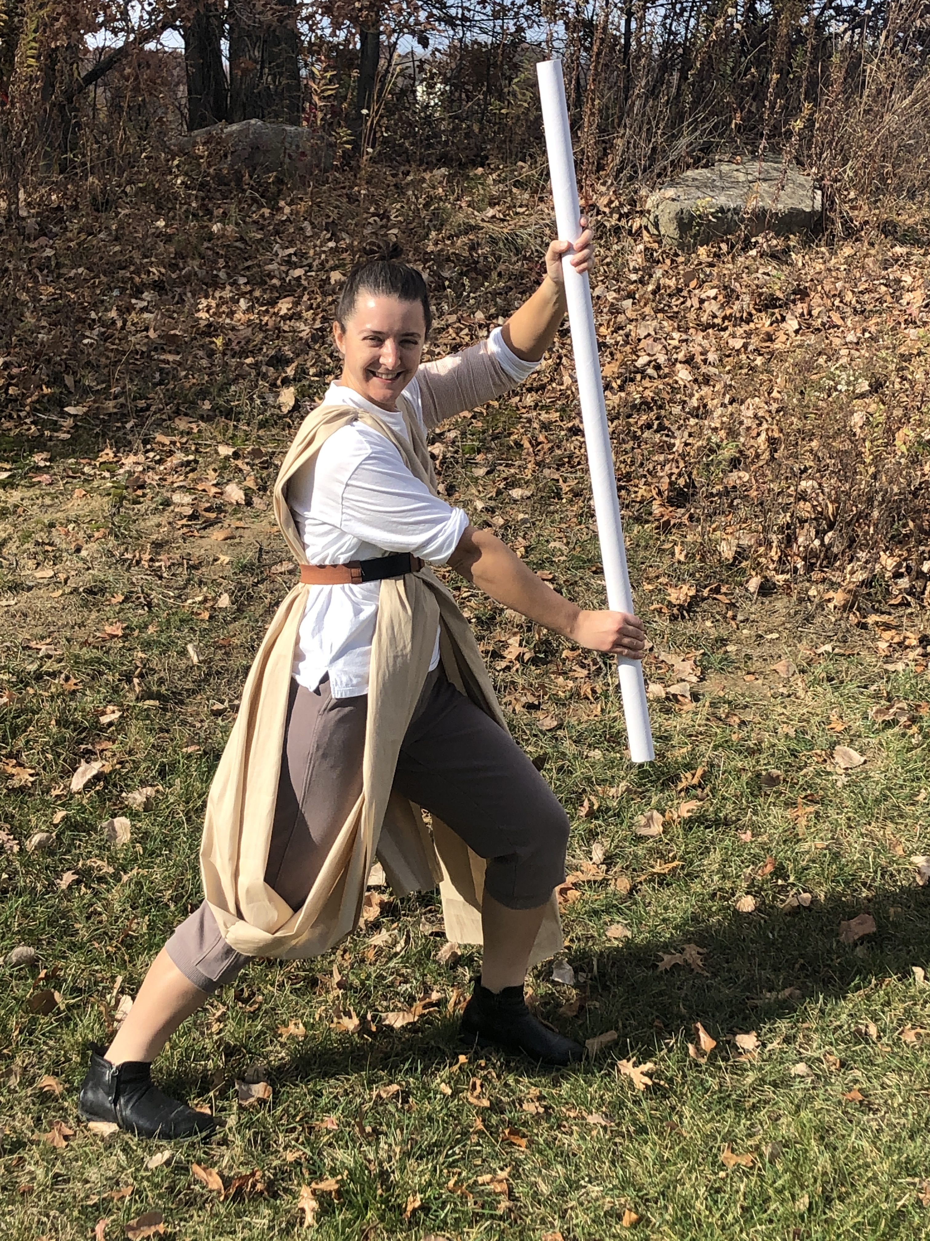 For the skywalker costume, I wore a white long-sleeve shirt and brown sweatpants that I rolled up to my knees with my ankle boots. The sash was made from 2 ½ yards of tan fabric cut in half lengthwise from the clearance section of Hobby Lobby that I stitched together as one long piece. I put clear rubber bands around the fabric of my shoulders when crisscrossing the sash across my chest and turned one of my belts inside out so that it was plain brown to hold it all together. There is a bandage wrapped around my upper arm that I acquired from breaking my hand last year! The staff is a recycled tube from Christmas wrapping paper to fight off my enemies because I didn’t have enough time to create my own lightsaber. My favorite part of being Rey is definitely the triple-bun masterpiece that adorns my head. May the Force Be With You!