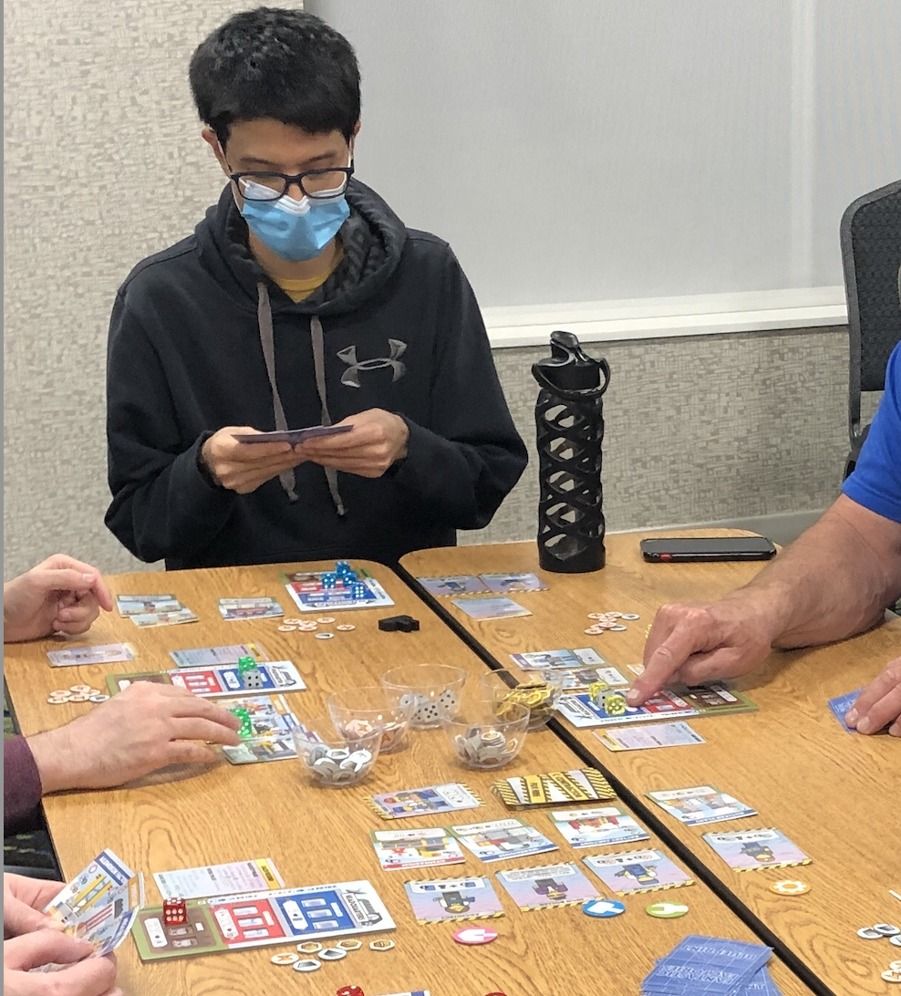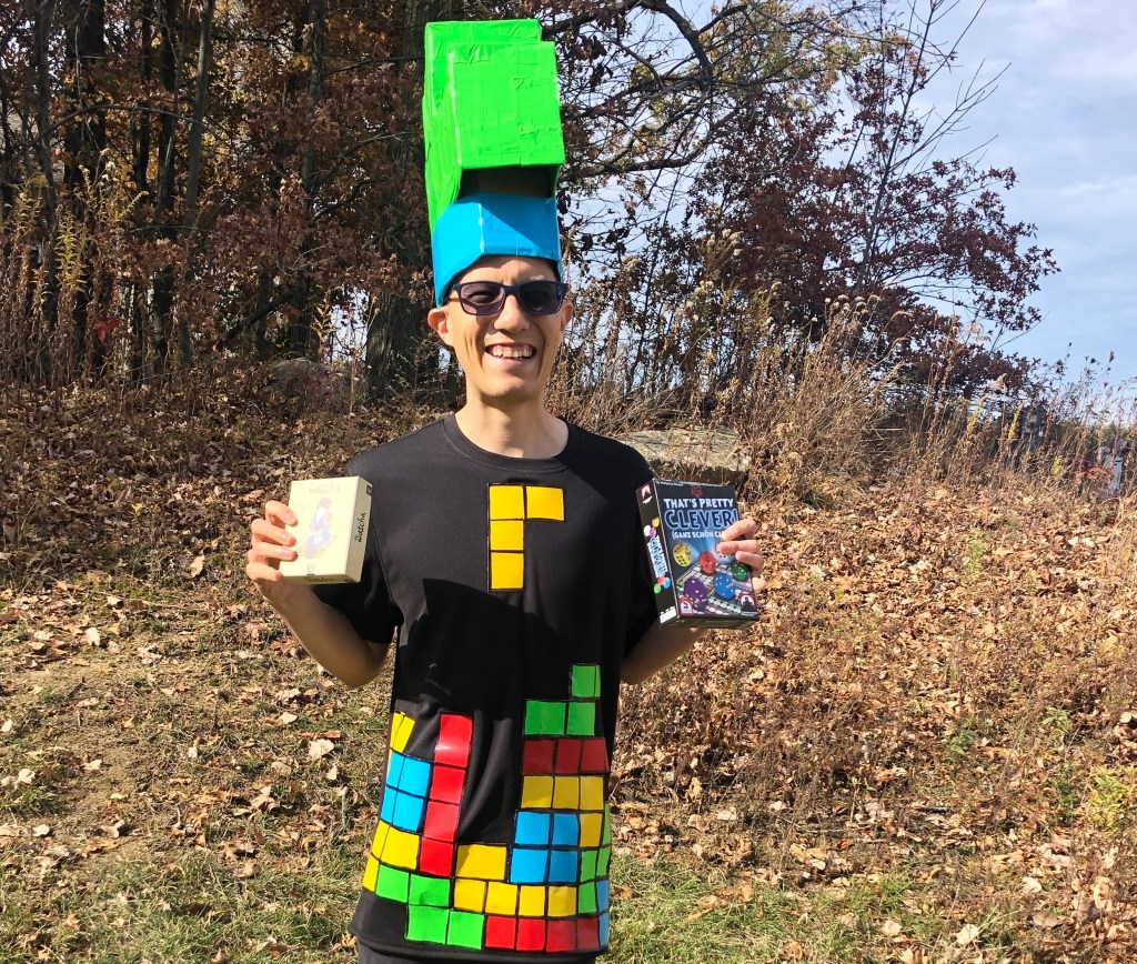 Since we are dressing up for the board game club on Halloween, Derek wanted to become a game himself so chose to be Tetris! We’ve played lots of polyomino board games that have “Tetrisy” themes like Blokus, Project L, Isle of Cats, New York Zoo, and Cartographers, just to name a few. These are some of my favorite games to play because I was a big Tetris fan as a kid and I like games that challenge me to fit a puzzle together on the game board.