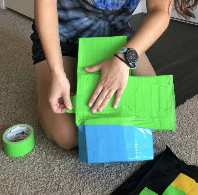 We started by making his hat out of recycled cardboard and duct tape to form a Tetris piece floating in the air. The game board was a solid black T-Shirt that we pieced together with strips of duct tape outlined in black sharpie to represent Tetris shapes in red, yellow, blue, and lime green. I was so happy recreating this puzzle that Derek had to remind me that there couldn’t be a complete row of squares anywhere on the shirt or it would have been cleared in the game of Tetris so we made sure to stack the pieces in obscure places as if running out of time! Sprout made herself useful by pouncing on the shapes as we taped them to the shirt.
