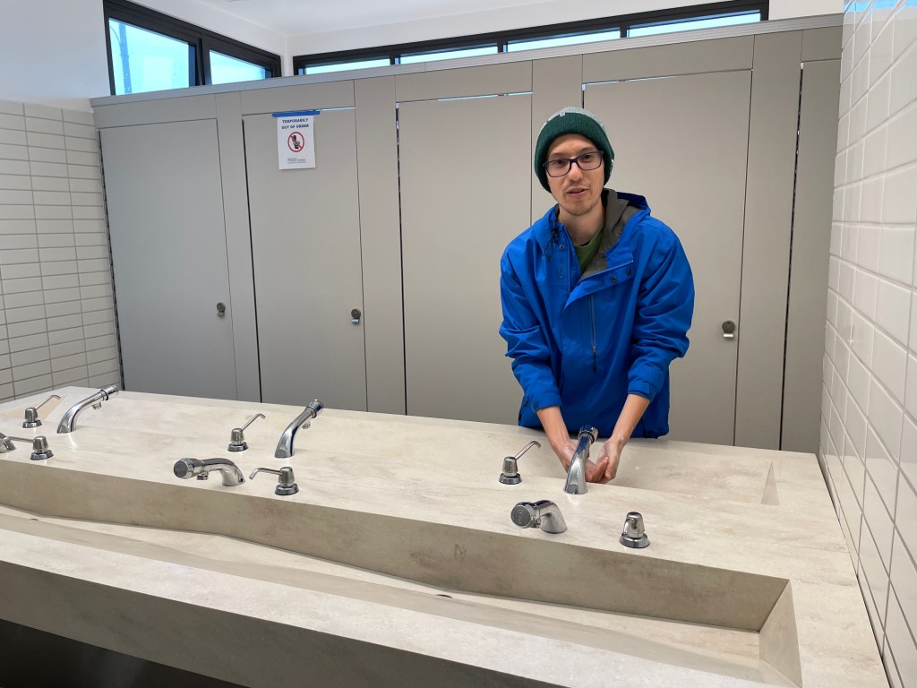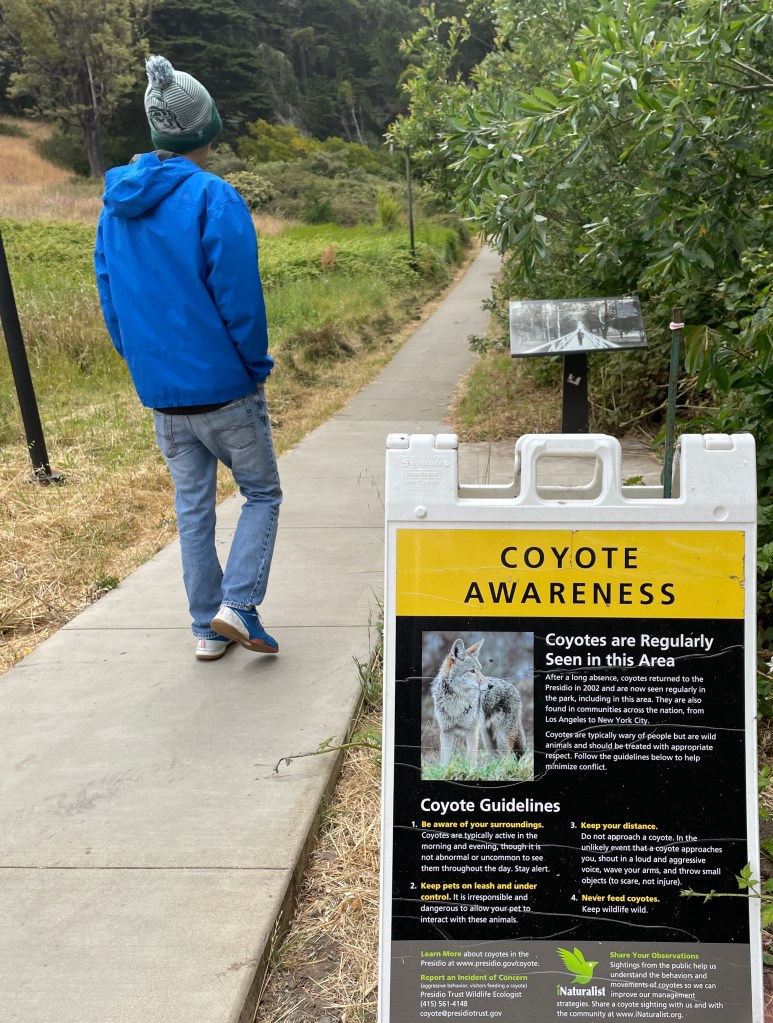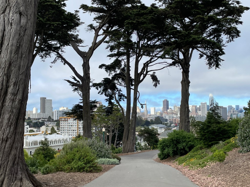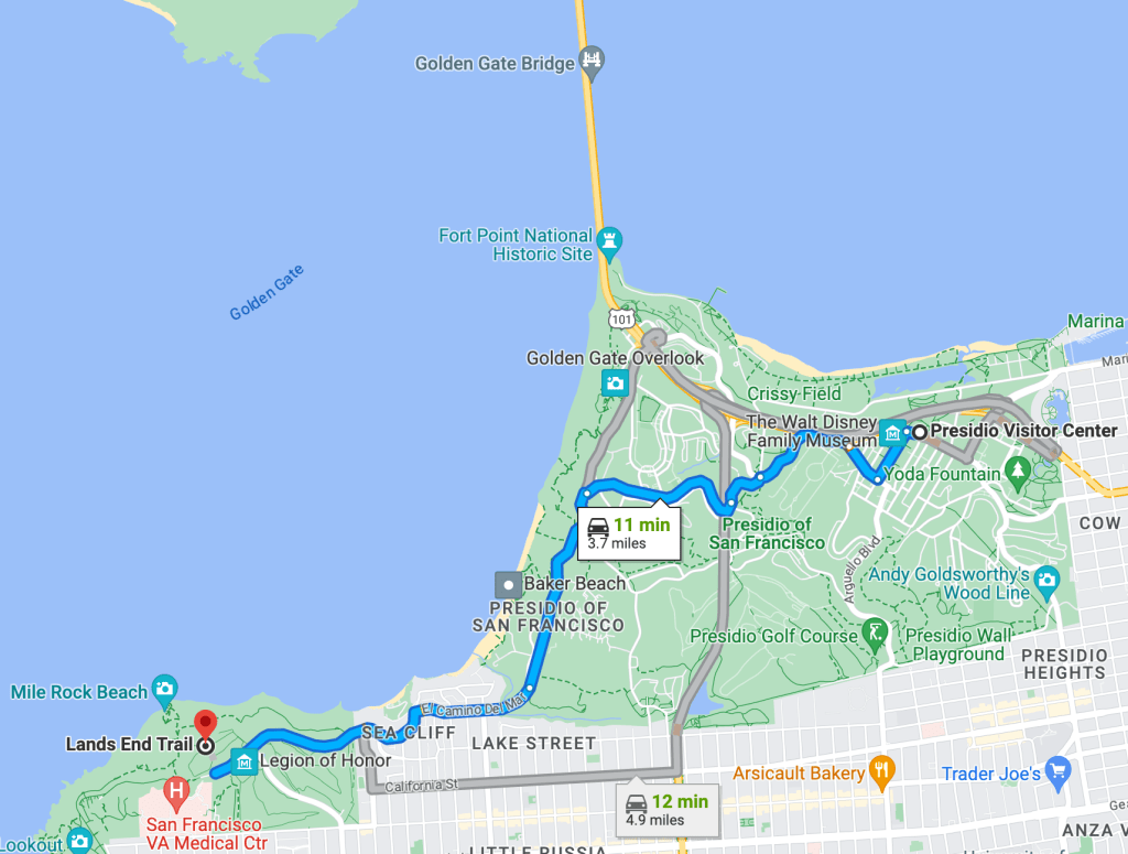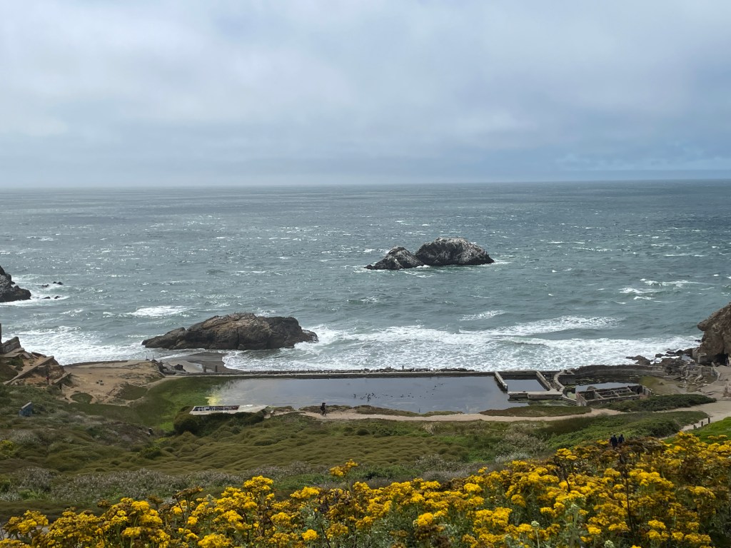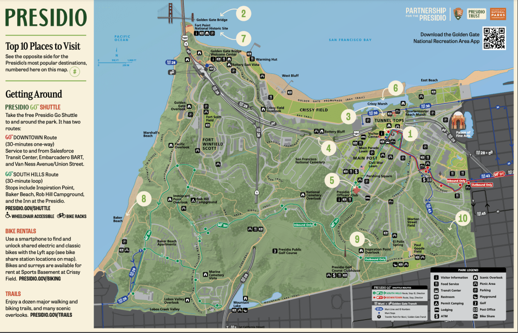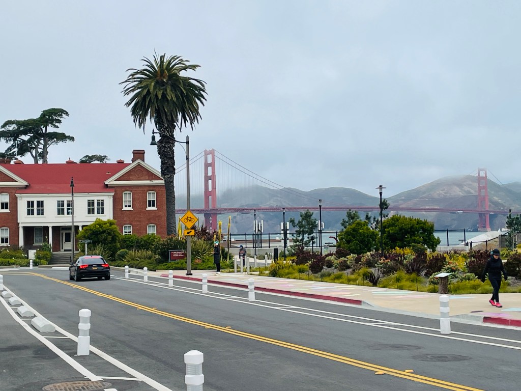 Presidio Park is a great checkpoint for visitors. We took transit to the park on our city day and viewed the national park exhibits detailing the history of the Golden Gate Bridge while also reviewing the trails and transit options with the ranger. The Tunnel Tops overlook the Golden Gate in the distance on an open hill with flowers and silly chairs. When we were exploring Presidio, food truck vendors and staff were setting up for a concert on Tunnel Tops. There is also a gender inclusive public restroom that we both used with individual stalls and an open concept that is open until 9:00 pm. Public restrooms are very hard to find in downtown San Fran so it was nice that we could count on this one being open while conveniently located next to a transit drop-off point with the free “Go Downtown” park bus route.