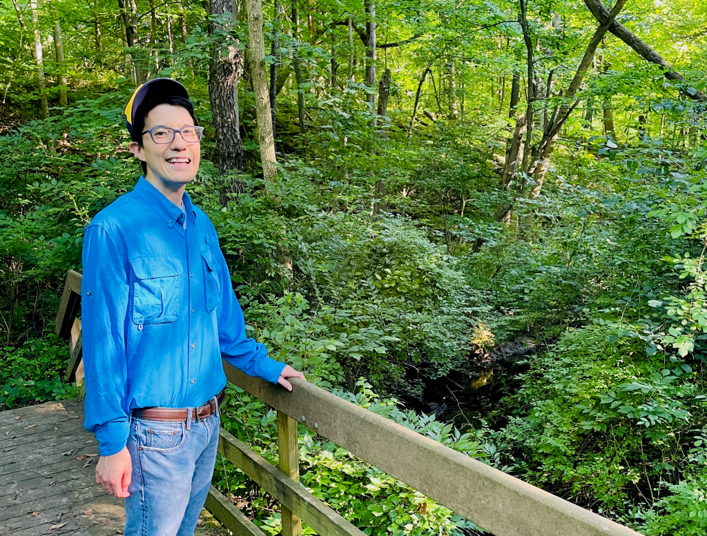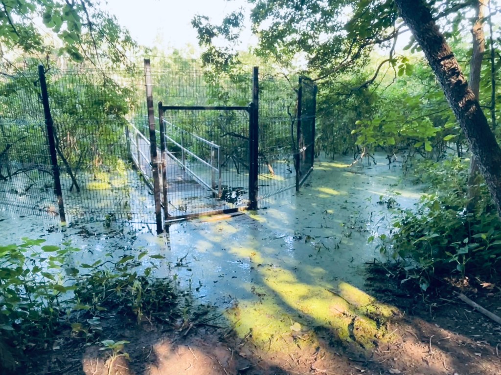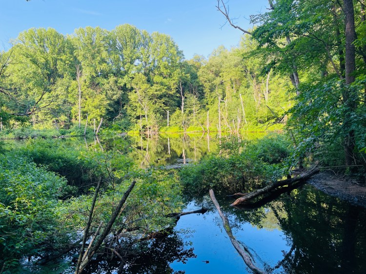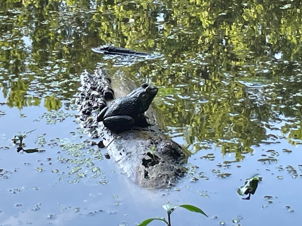 About the halfway point of the trail, we came to a bridge where the trees opened up to a body of water with a crystal clear reflection. It appeared to be a lake but after reading the signage, this ring of open water is considered a moat that surrounds the bog and separates the floating sphagnum moss from the upland forest. Rainwater runs over the soil and picks up minerals and nutrients that enter the edge of the basin in the moat that support different plants since this water is 100 times less acidic than the bog. This was the highlight of our hike with bullfrogs resting on the logs below. We also saw a beaver dip under the water and the fruits of his labor where a dam of sticks was piled under the bridge.