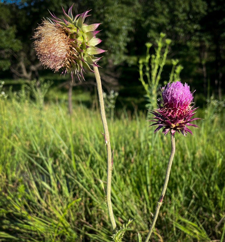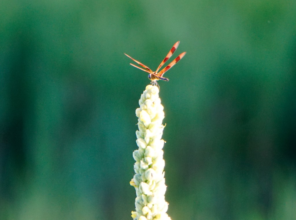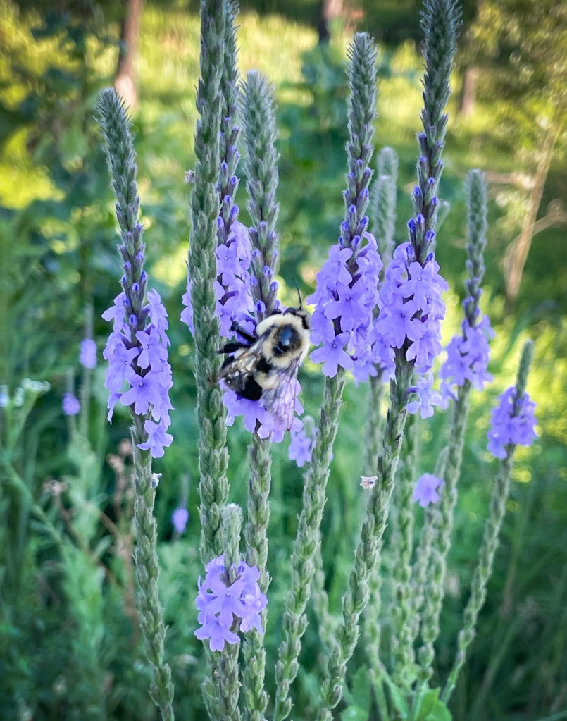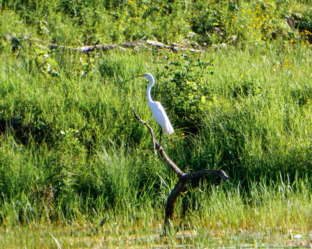 We also heard the whooshing snorts of a male deer with his family leaping away after spotting us on the trail. A serene Great Blue Heron swooped past the Great Egret into the marsh and butterflies fluttered around us like the wisps of pollen that floated in the breeze. This was both a birder’s paradise and a botanist’s playground. According to Derek, “if I were a bear, this is where I would live-where there are plenty of berries to eat and places to sleep.”