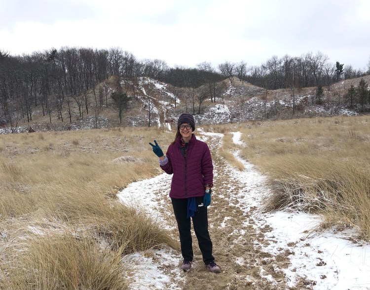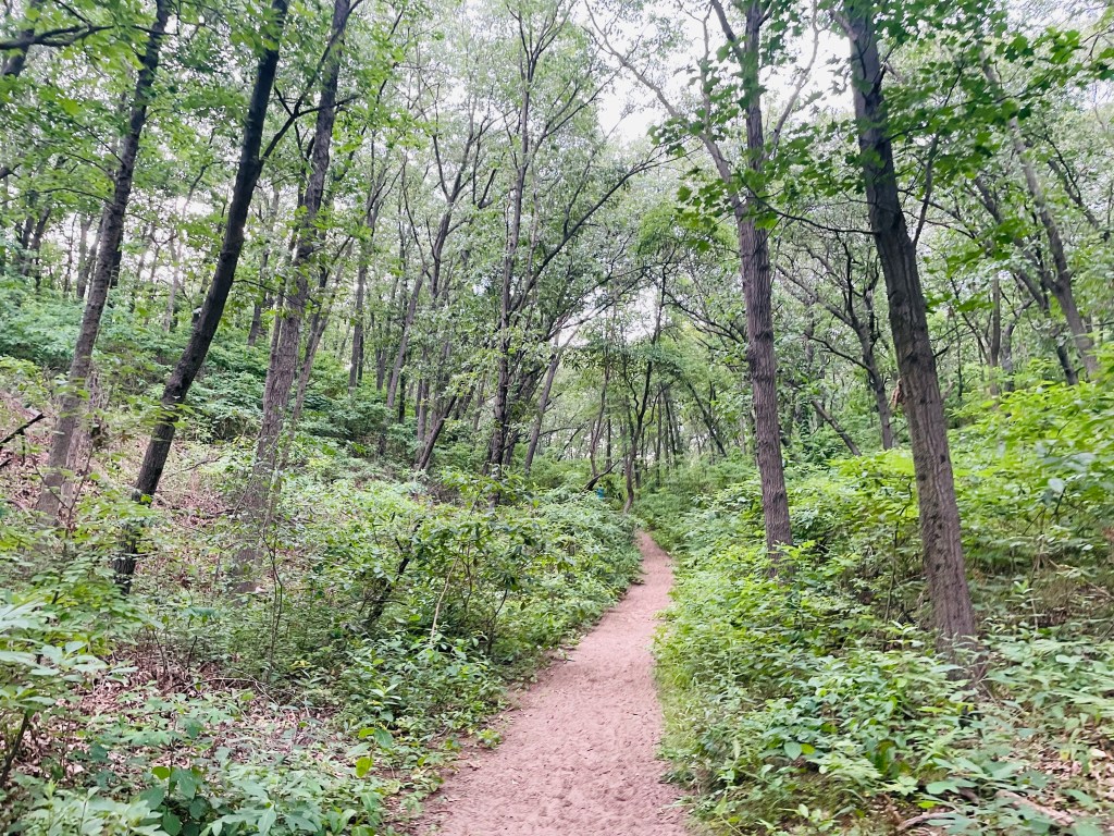 On a clear day, you can see the Chicago skyline in the distance across the lake with skyscrapers that look like a tiny castle fortress in pale blue undertones. Sometimes we hike down to the beach to dip our toes in the water or see the waves, but then we have to trek back up the dune to continue where we left off! You can also follow the shoreline west for about 0.2 miles and look for trail signs to head back over the dune.